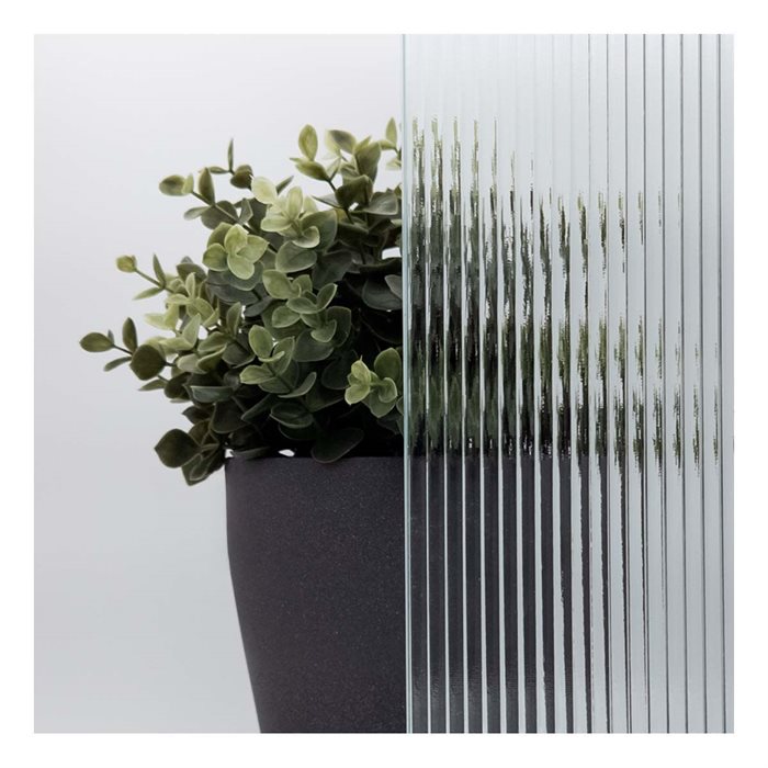 Glasets vertikala linjer diffunderar när du tittar på det. Det ger avskildhet och ett vackert dekorativt uttryck, men samtidigt låter det ljus tränga in.