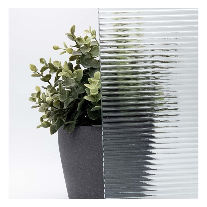 Glasets horisontella linjer diffunderar när du tittar på det. Det ger avskildhet och ett vackert dekorativt uttryck, men samtidigt låter det ljus tränga in.