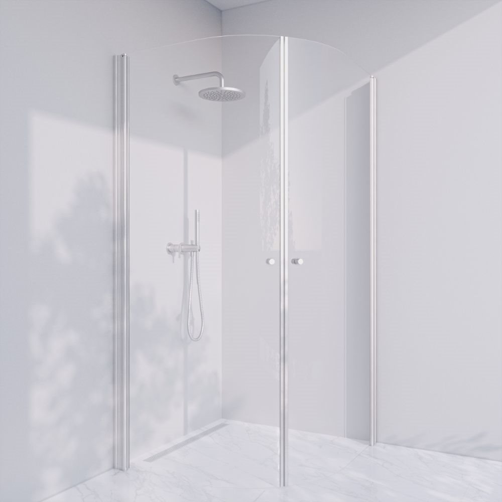Duschkabinen från Prime-serien består av en dubbel glasdörr, båda i böjt glas. Dörrbladen är monterade med underhållsfria lyftgångjärn som lyfter dörrarna 5 mm när de öppnas. Glaset är monterat i smala aluminiumväggprofiler. Aluminiumprofilerna är av hög kvalitet och levereras med extra borrhål för att kunna fästas extra stabilt i väggen, vilket ger duschkabinen en hållbar stabilitet under hela dess livslängd. Glaset i duschkabinen är 6 mm klart härdat säkerhetsglas.